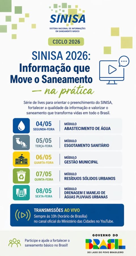 Dos dias 04 a 08 de maio, o Ministério das Cidades está promovendo a série de capacitações “SINISA 2026: Informação que Move o Saneamento na Prática”, com o objetivo de orientar os municípios no preenchimento e qualificação das informações do Sistema Nacional de Informações em Saneamento Básico (SINISA).