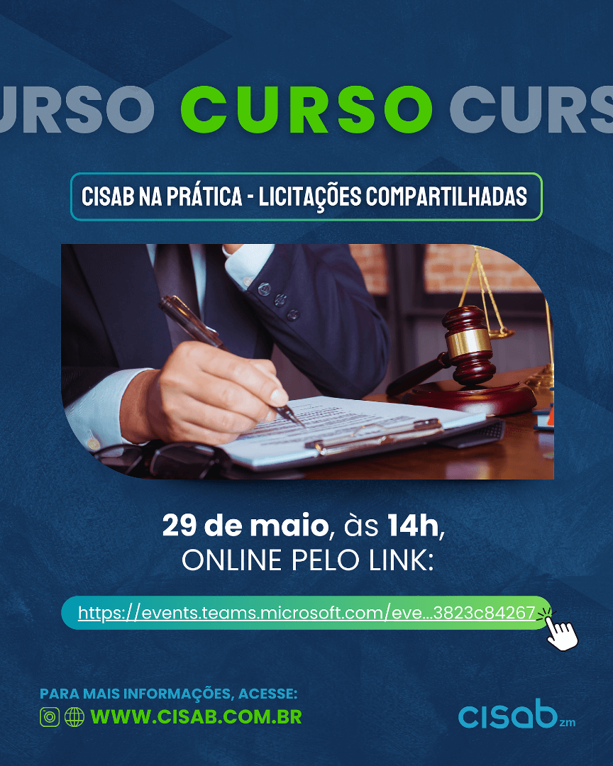 O CISAB Zona da Mata realizará nos dias 07, 08 e 09 de junho de 2022, de 08h às 17h, um curso sobre a Nova Lei de Licitações (Lei 14.133/2021)