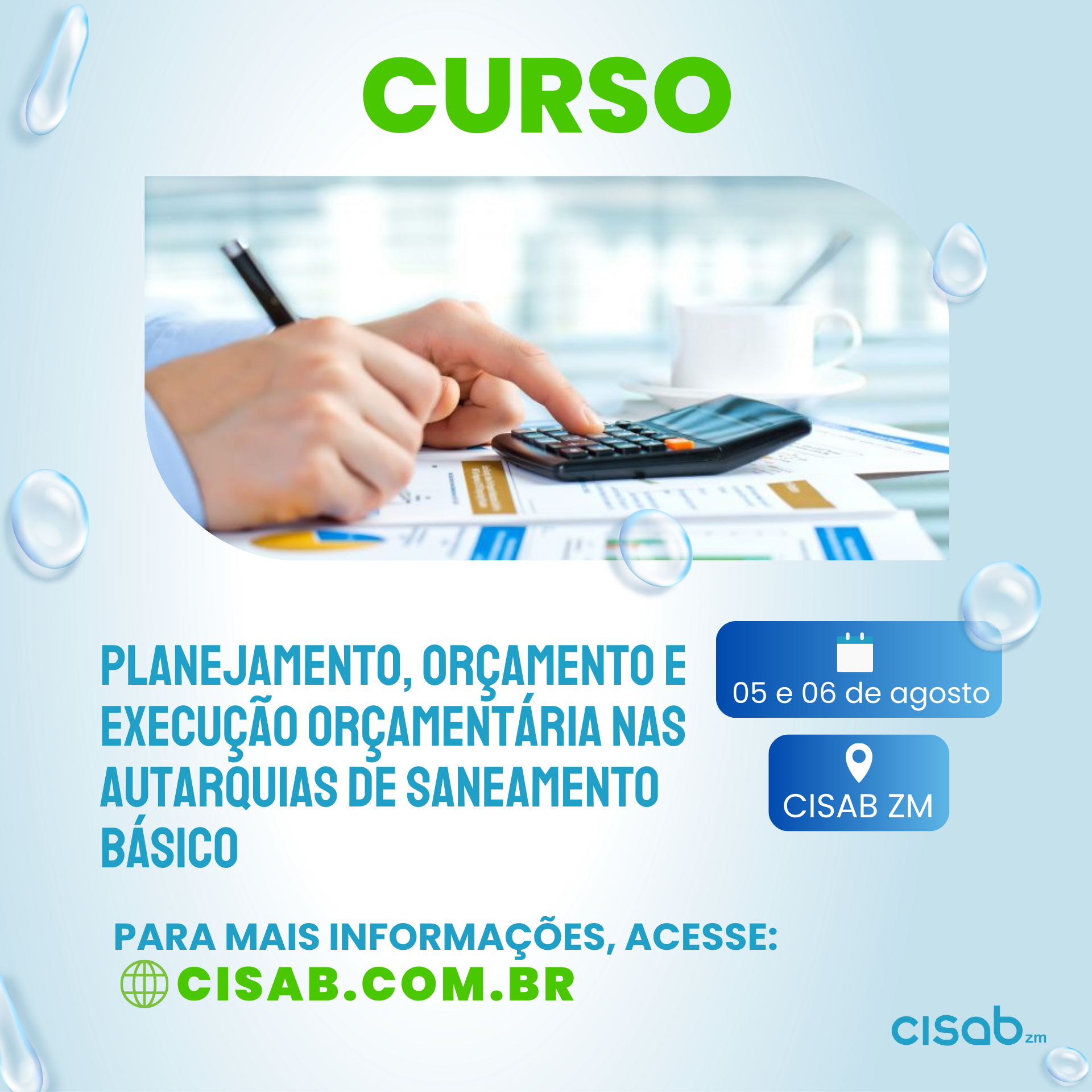 O CISAB Zona da Mata realizará nos dias 19 e 20 de julho de 2022 das 8h às 12 horas, o Curso sobre Orçamento público para o exercício de 2023, com ênfase em autarquias de saneamento. Seu objetivo é capacitar servidores e gestores públicos de autarquias de água e esgoto na elaboração do orçamento de 2023, levando em consideração a legislação referente ao SIAFIC e das novas fontes /destinações de recursos. Sua realização será online via plataforma Zoom, com link a ser disponibilizado.